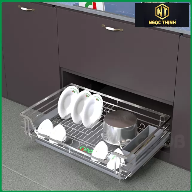 Một số mẫu kệ còn được trang bị khay hứng nước phía dưới, giúp giữ cho khu vực tủ bếp luôn khô ráo và sạch sẽ. Khay có thể tháo rời để vệ sinh dễ dàng.