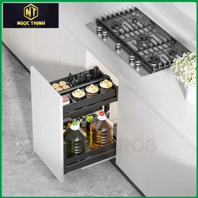 Sản phẩm thường được lắp đặt trong tủ bếp dưới, giúp tận dụng không gian bên trong tủ bếp một cách hiệu quả. Khi cần sử dụng, người dùng chỉ cần kéo kệ ra ngoài là có thể dễ dàng lấy các vật dụng cần thiết.