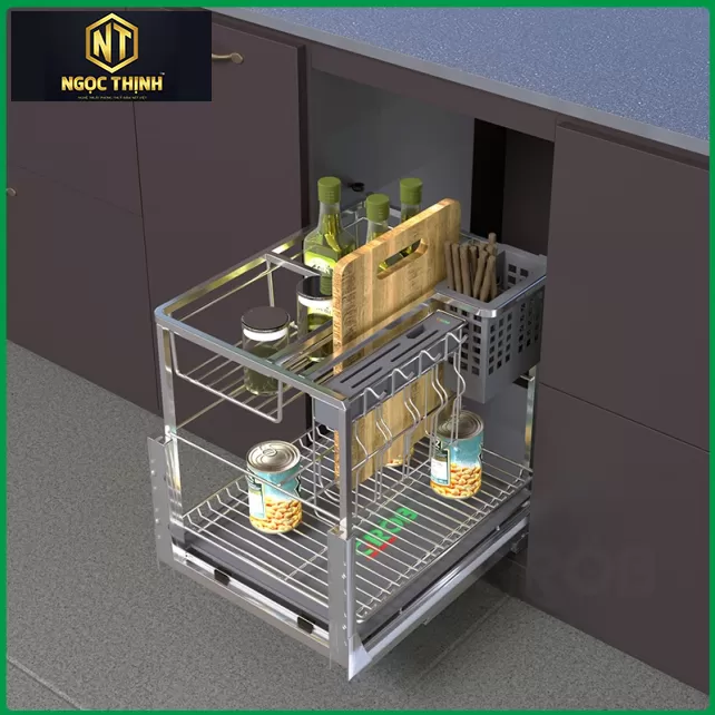 Sản phẩm thường được lắp đặt trong tủ bếp dưới, giúp tận dụng không gian lưu trữ bên trong tủ bếp một cách hiệu quả. Khi cần sử dụng, người dùng chỉ cần kéo kệ ra ngoài là có thể lấy các vật dụng cần thiết một cách dễ dàng.
