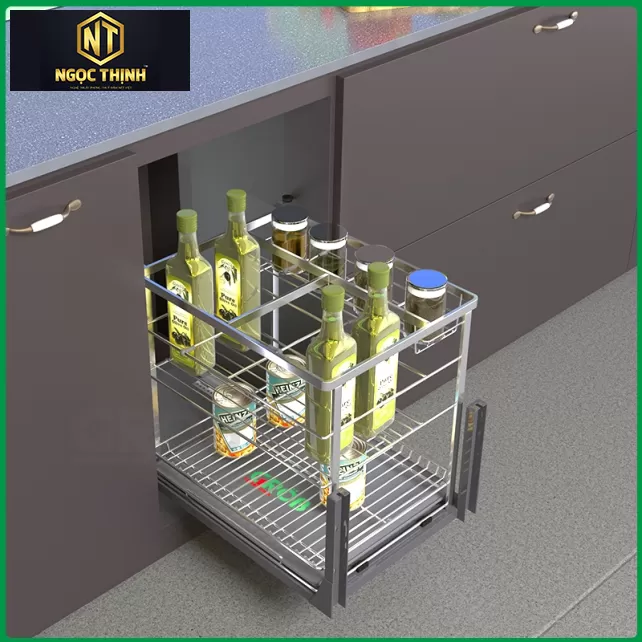 Tối ưu không gian lưu trữ: Thiết kế gọn gàng với các tầng chứa rộng rãi, phù hợp cho việc lưu trữ chai lọ, hộp gia vị một cách khoa học và tiện lợi.