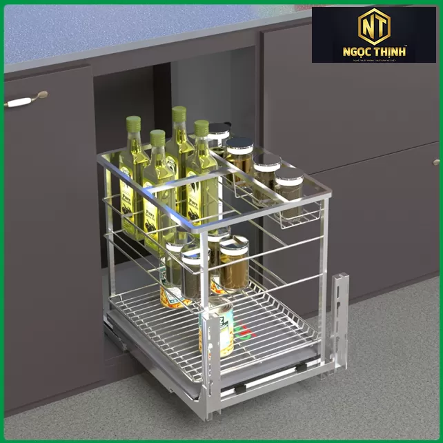 Ngoài ra, sản phẩm còn được trang bị hệ thống ray trượt giúp kệ có thể kéo ra ngoài nhẹ nhàng khi mở cánh tủ. Điều này giúp người dùng dễ dàng lấy các chai lọ gia vị bên trong mà không cần phải với tay sâu vào tủ.