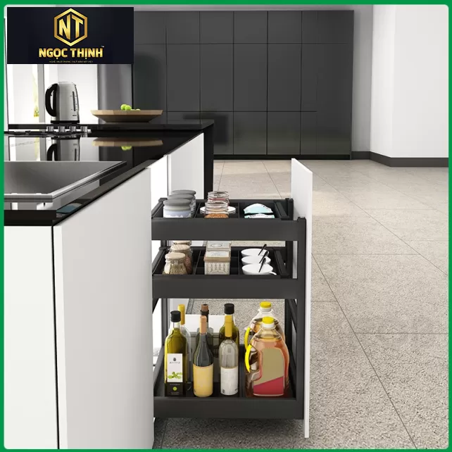 Kệ được thiết kế âm tủ gọn gàng và tiện dụng phù hợp với nhiều không gian bếp khác nhau.