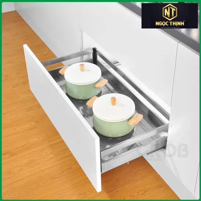 Ngoài ra, sản phẩm còn được trang bị hệ thống ray âm giảm chấn cao cấp giúp việc kéo kệ ra và đẩy vào trở nên nhẹ nhàng và êm ái. Cơ chế giảm chấn giúp hạn chế tiếng ồn và tăng độ bền cho sản phẩm trong quá trình sử dụng.