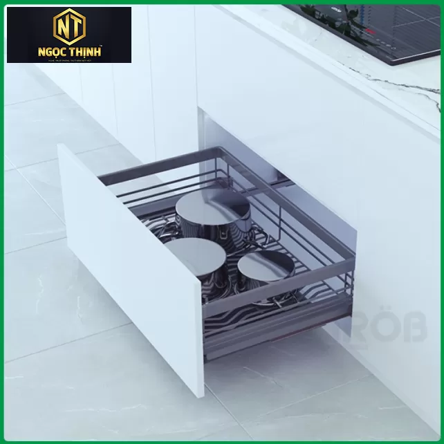 Kệ được trang bị hệ thống ray âm giảm chấn cao cấp, giúp việc kéo kệ ra và đẩy vào trở nên nhẹ nhàng và êm ái. Cơ chế giảm chấn giúp hạn chế tiếng ồn và tăng độ bền cho sản phẩm trong quá trình sử dụng.