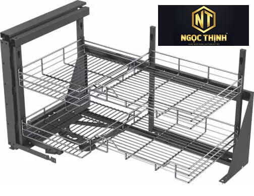 Khung thép chắc chắn kết hợp rổ inox hoặc thép sơn tĩnh điện chống rỉ sét, bền bỉ trong môi trường nhà bếp.