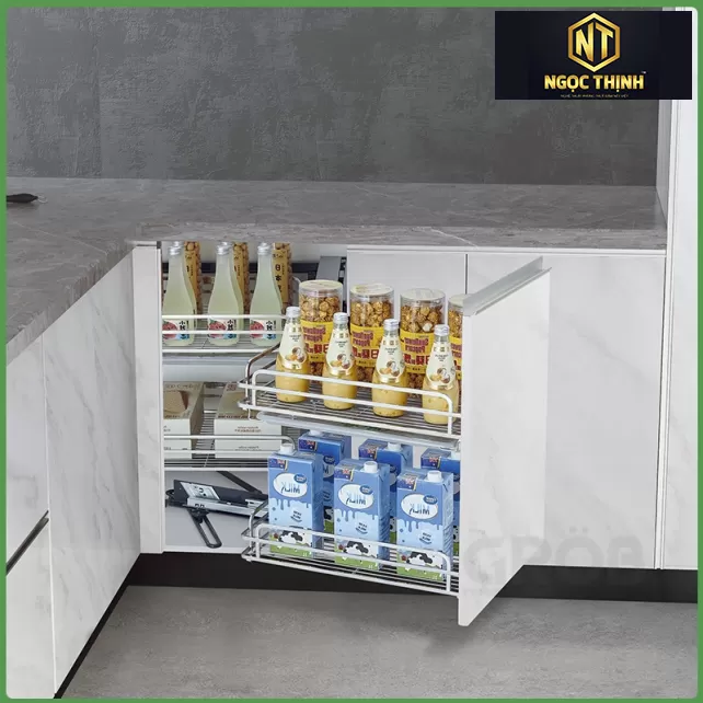 • Giữ căn bếp ngăn nắp, dễ lấy đồ dùng: Thiết kế xoay và kéo ra hoàn toàn giúp bạn dễ dàng lấy đồ, không cần tìm kiếm lâu.