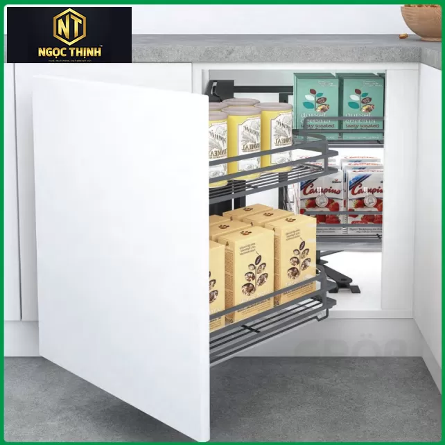 Kệ góc được thiết kế với hệ thống khay liên hoàn thông minh giúp các khay kệ di chuyển theo chuyển động của cánh tủ. Khi mở cánh tủ, toàn bộ hệ thống kệ sẽ trượt ra phía ngoài, giúp người dùng dễ dàng lấy các vật dụng bên trong mà không cần phải cúi sâu vào góc tủ.