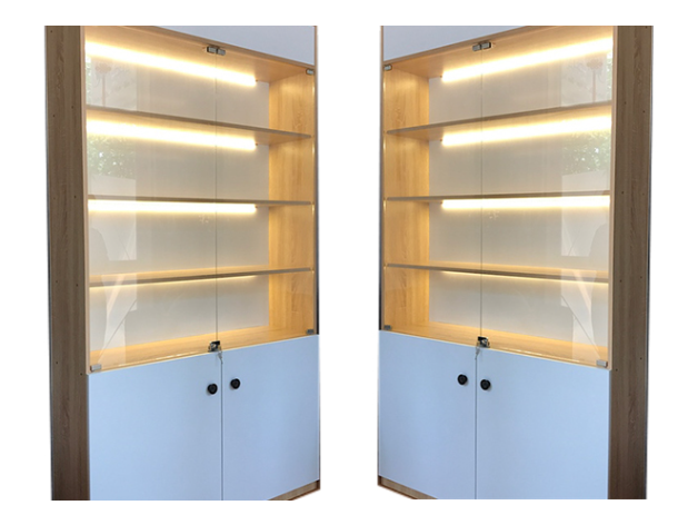 Kệ trưng bày có kính và đèn led.