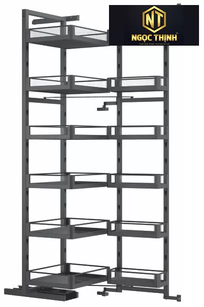 Thiết kế giỏ Hộp kính vuông góp phần tạo cảm giác nhẹ nhàng, thanh thoát cho tủ kho. Ngoài ra với thiết kế 6 tầng, 12 rổ đựng thì được thiết kế thu gọn trong khoang tủ góp phần tăng tính thẩm mĩ, tạo sự gọn gàng cho căn bếp nhà bạn.