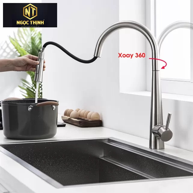 Vòi rửa dạng dây rút có thể đưa vòi tới mọi vị trí trong bồn rửa do khả năng xoay được 360 độ và có thể kéo ra kéo vào, điều chỉnh được độ cao của vòi, độ rộng của nước phun ra một cách dễ dàng.